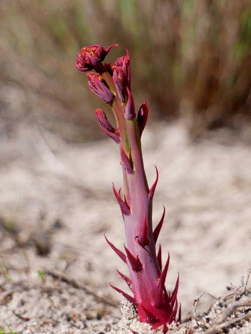 The epithet, erythrorhiza, is derived from the Greek erythros (red), and rhiza (root), in reference to the subterranean organs (the tuber and lateral, root-like, tuber-producing adventitious stolons), which are orange when alive.