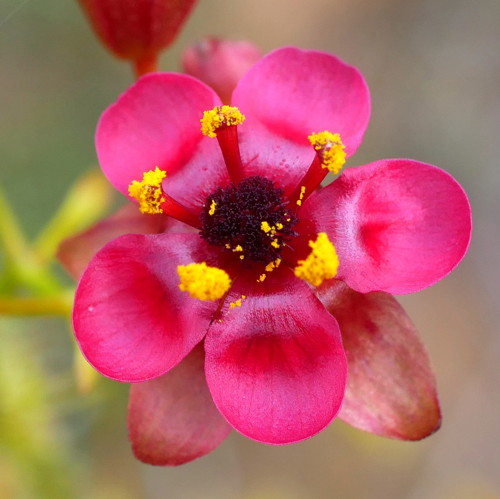 The specific epithet is derived from the Latin ruber (=red) and calyx in reference to the red sepal colour of this species that provides a distinct colour contrast to the yellowish green stem and peduncle.