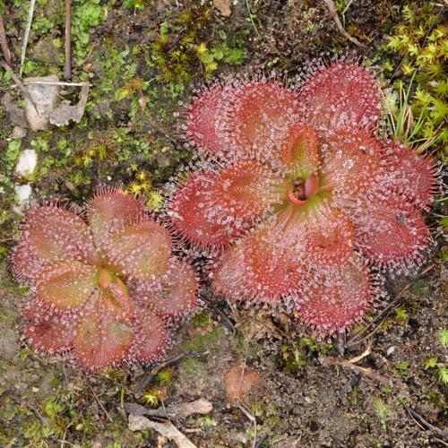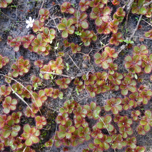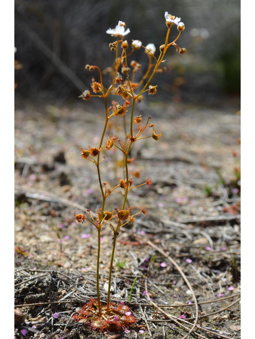 Drosera subhirtella is named from the Latin sub (somewhat) and hirtellus (hairy, but less than hirsute), in reference to its all-over glandular indumentum.